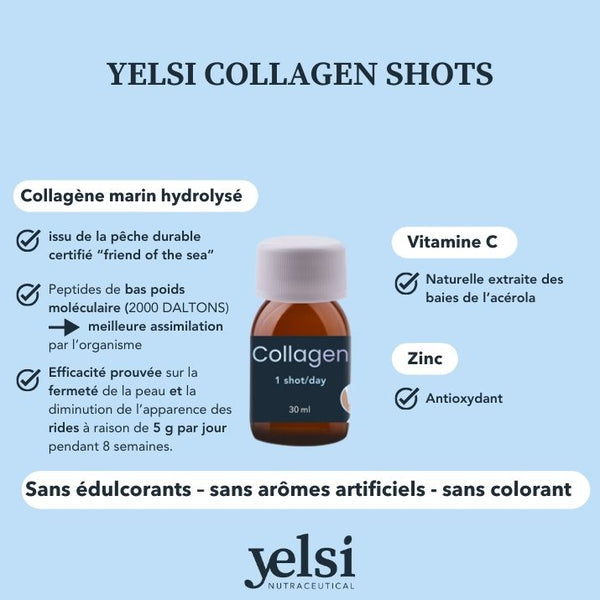 Boostez votre beauté avec notre shot de collagène marin hydrolysé. Notre format shot directement prêt à l'emploi s'emportera facilement avec vous pour une pause beauté agréable et naturelle !
